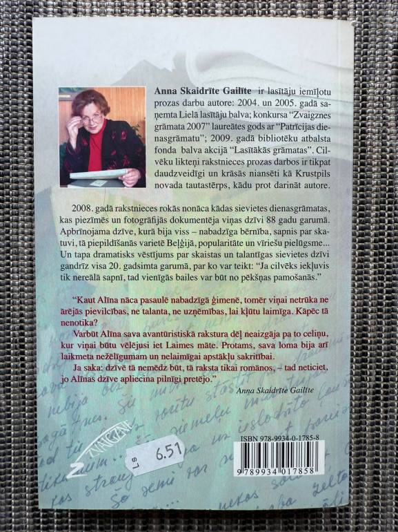 | Grāmata "ALĪNA. Likteņa celtā un likteņa gremdētā" (Anna Skaidrīte Gailīte) balstīta uz kādas sievietes dienasgrāmatu, kas dokumentē viņas 88 gadu dzīvi — no bērnības nabadzības līdz slavai un vientulībai vecumdienās. Autore atklāj Alīnas sapņus, uzvaras un zaudējumus. | |