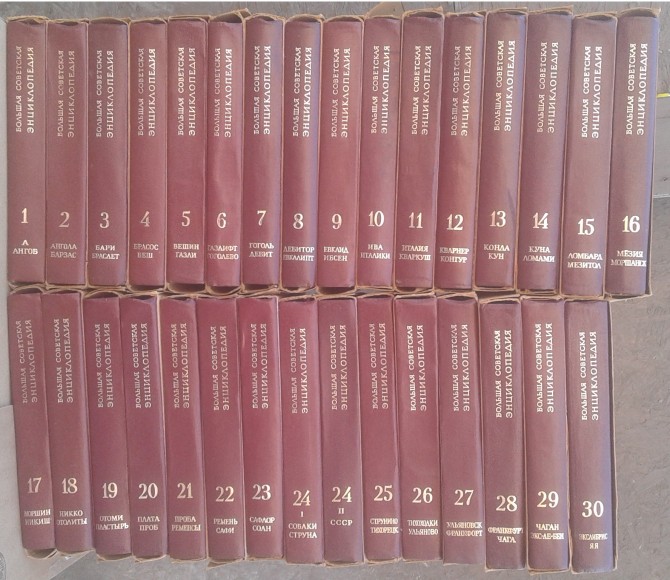 | Lielās padomju enciklopēdijas trešais izdevums. 30 sējumi + papildus 2 sējumi, kas veltīti Padomju savienībai. Grāmatas ļoti labā stāvoklī, glabājušās katra oriģinālā kartona ietvarā. Visas kopā ļoti smagas, pašsavākšana Rīgā Jaunciemā. | |