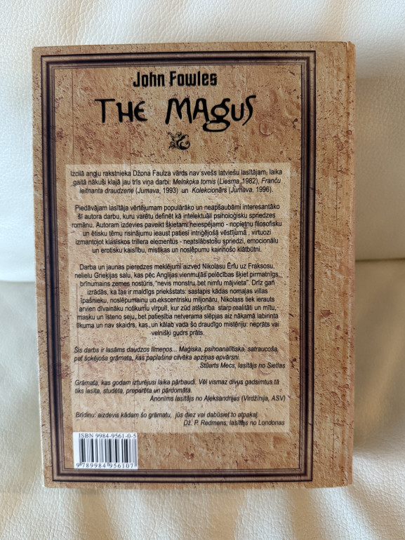 | ved lasītāju uz nomaļo Fraksosas salu Grieķijā, kur jaunais angļu skolotājs Nikolass Ērfs, noguris no Londonas rutīnas un neizlēmīgām attiecībām, meklē jaunus iespaidus. Tur viņš iepazīst noslēpumainu, bagātu vientuļnieku – ekscentrisku villas saimnieku, kura inscenētās “izrādes” un psiholoģiskie eksperimenti aizslauka Nikolasu aiz robežas, kur saplūst mīts un realitāte, patiesība un maldi. | |