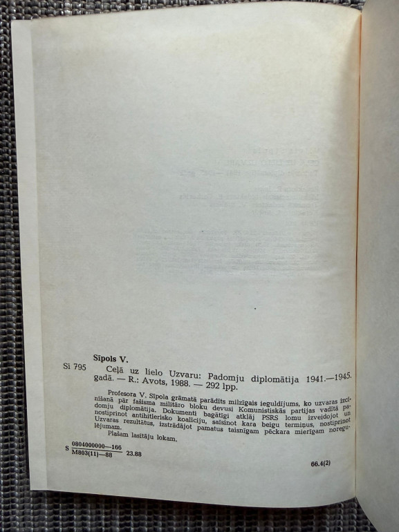 | V. Sipola grāmata "Ceļā uz lielo uzvaru" (angļu valodā "The Road to Great Victory") aptver Padomju Savienības diplomātiskās aktivitātes Otrā pasaules kara laikā no 1941. līdz 1945. gadam. Grāmatā tiek analizēti svarīgi diplomātiskie notikumi, sarunas un stratēģijas, kas veicināja Padomju Savienības uzvaru karā | |