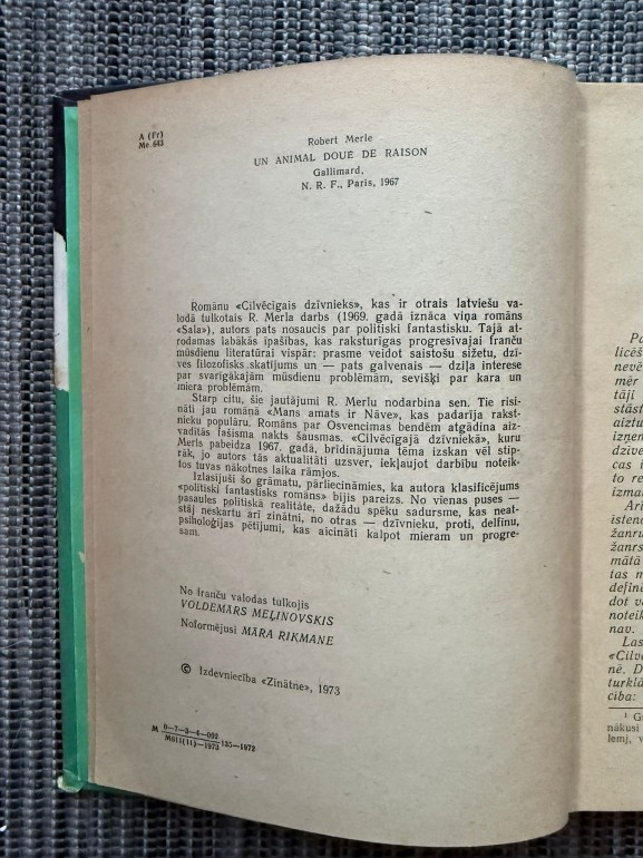 | Grāmata "Cilvēcīgais dzīvnieks" (1973) ir Robēra Merla politiskās fantastikas romāns par delfīniem, kuri iemācās cilvēku valodu. Profesors Sevilja ar cieņu un sapratni veido kontaktu ar delfīniem, bet viņa atklājumu steidz izmantot militārās aprindas. Darbs raisa pārdomas par saprātu, cilvēcīgumu un zinātnes ētiku. | |
