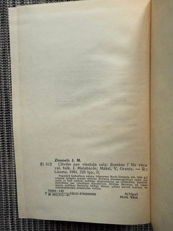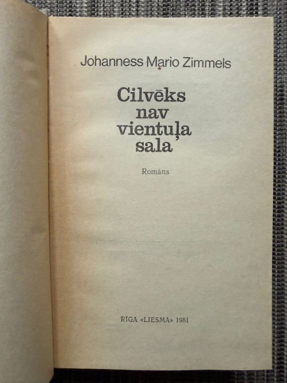 | Grāmata "Cilvēks nav vientuļa sala" (Johanness Mario Zimmels) ir emocionāli piesātināts romāns par izpriecu meklētāju, kurš dzīvo kopā ar pasaulslavenu aktrisi. Lai gan viņš slepeni ienīst šo sievieti un viņas bērnu, viņš nespēj atteikties no greznās dzīves. Kad viņa pasaule sabrūk, sākas ceļš uz patiesu cilvēcību. Romānā spilgti attēlota kino industrijas intriģējošā un nežēlīgā pasaule, kurā cerī | |
