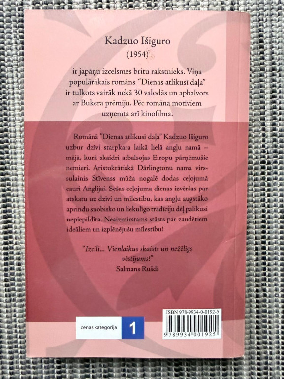 | Dienas atlikusī daļa ir Kazuo Išiguro romāns par majordomu Steivenu, kurš atskatās uz savu dzīvi, pienākumiem un zaudētajām iespējām. Grāmata ir īpaša ar introspektīvu, mierīgu stāstījumu, kas pēta pienākuma, cieņas un personīgās laimes konfliktu. | |