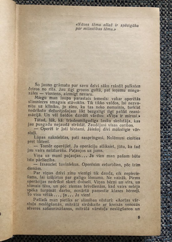 | Grāmatas autors Nikolajs Amosovs — izcils ķirurgs, zinātnieks, rakstnieks — šajā darbā, kas faktiski ir viņa dienasgrāmata, fiksē divos gados sirds operācijām veltītās dienas un stundas. Te kā grēksūdzē atklājas ārsta šaubas, pārdomas, rūgtā savas bezspēcības apziņa neizbēgamā priekšā, izmisums un, protams, arī laime un gandarījums par uzvarām, kas gūtas cīņā ar nāvi. | |