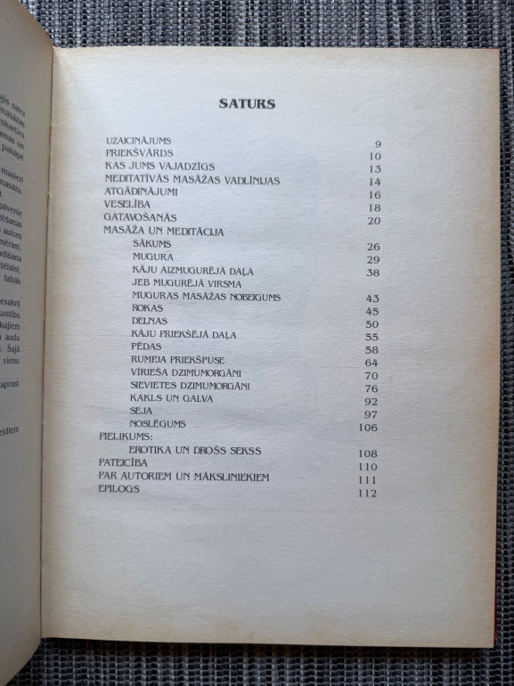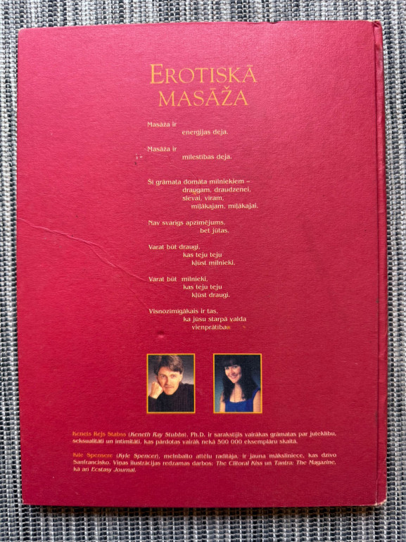 | Grāmatā autors ir apkopojis savu ilggadējo pieredzi, sistematizējis un aprakstījis erotiskās masāžas paņēmienus. Erotiskā masāža var sniegt jaunas, patīkamas un veselīgas sajūtas, dažādojot cilvēku dzīvi. Šī masāža paceļ citā pakāpē attiecības starp vīrieti un sievieti. Grāmata ir bagātīgi ilustrēta, tas palīdzēs vieglāk saprast masāžas virzienus, kā arī to, kuras ķermeņa daļas ir jāmasē. | |