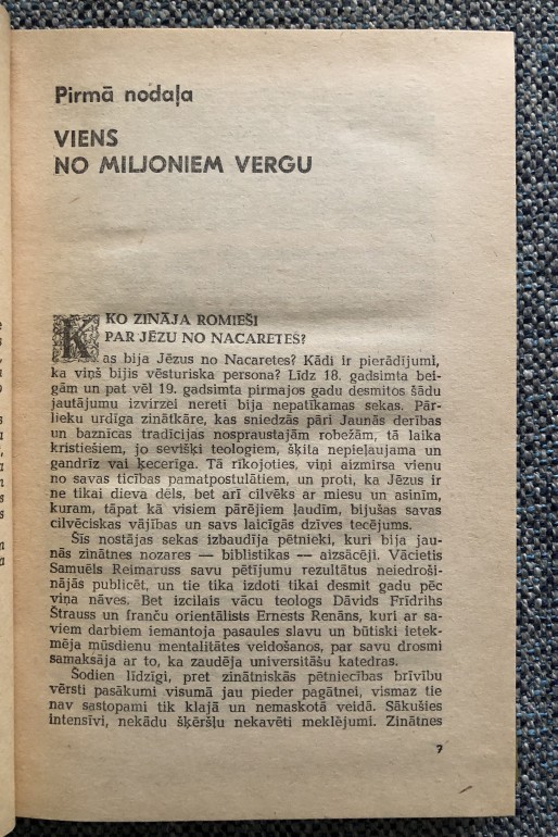 | Zināmā mērā ir «Bībeles stāstu» turpinājums, tiek analizēti kanoniskie Jaunās derības teksti, lasītājs tiek iepazīstināts ar mūsdienu vēsturzinātnes, lingvistikas un arheoloģijas atziņām. Jaunās derības sacerējumi radušies dibinoties uz mutvārdu tradīciju, kas attīstījās saskaņā ar folkloras tradīcijām, kā arī pateicoties evaņģēliju autoru apzināti tendenciozai jaunradei. | |