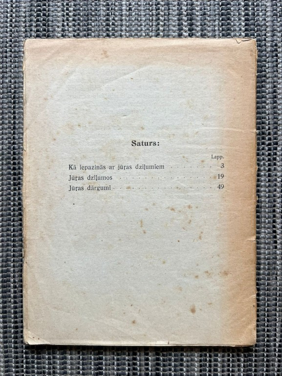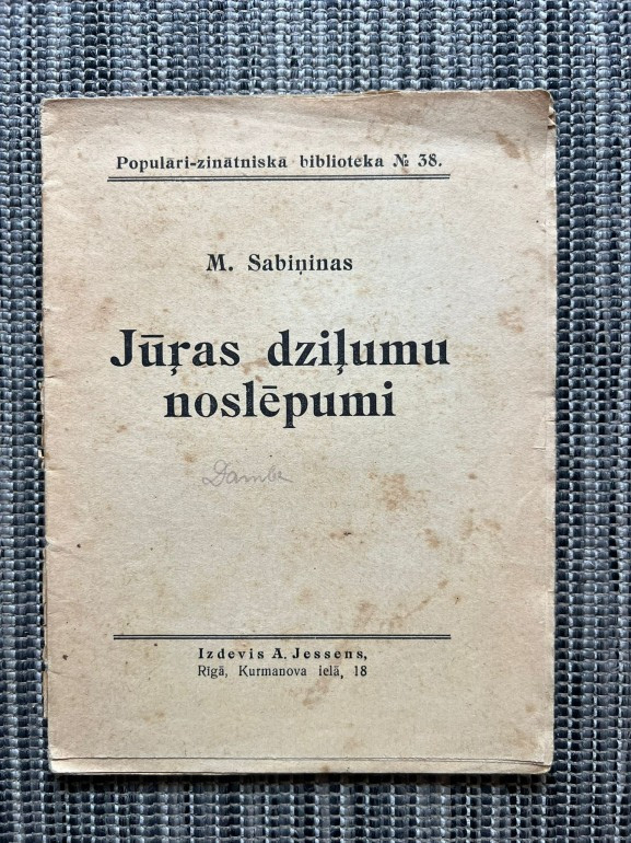 | Grāmata “Jūras dziļumu noslēpumi” (M. Sabiņinas, ap 1920) ir populārzinātniska brošūra no sērijas Populāri zinātniskā bibliotēka. Tajā apkopoti trīs raksti: “Kā iepazinās ar jūras dziļumiem”, “Jūras dziļumos” un “Jūras dārgumi”, kas stāsta par okeāna izpētes vēsturi, zemūdens pasaules noslēpumiem un dabas bagātībām. Apjoms – 67 lpp., izdevējs E. Pīpiņa un J. Upmaņa spiestuve | |