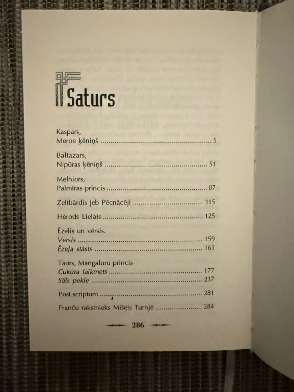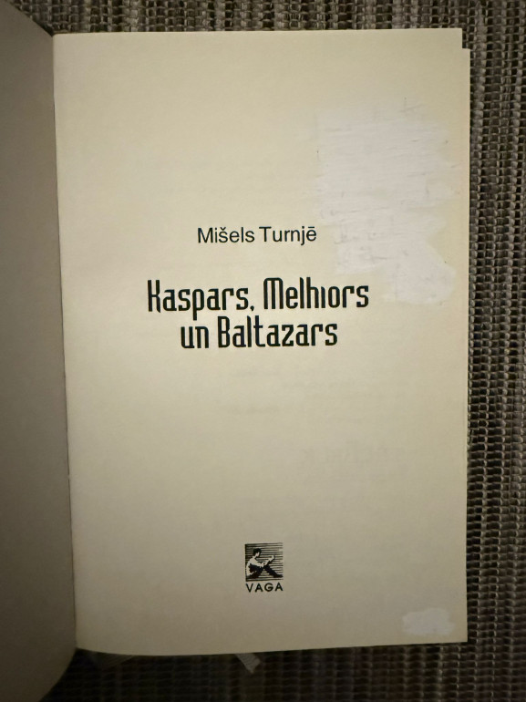 | Grāmata “Kaspars, Melhiors un Baltazars” ir Mišela Turnjē mītiska romāna versija par Austrumu gudro ceļu uz Betlēmi. Trīs viņu stāsti savijas ar ceturtā maga Taora vēlo, pārvērsošo ceļojumu. Tēmas: ticības atklāsme, nevardarbības un varas izvēle, mākslas nozīme kristīgajā skatījumā | |