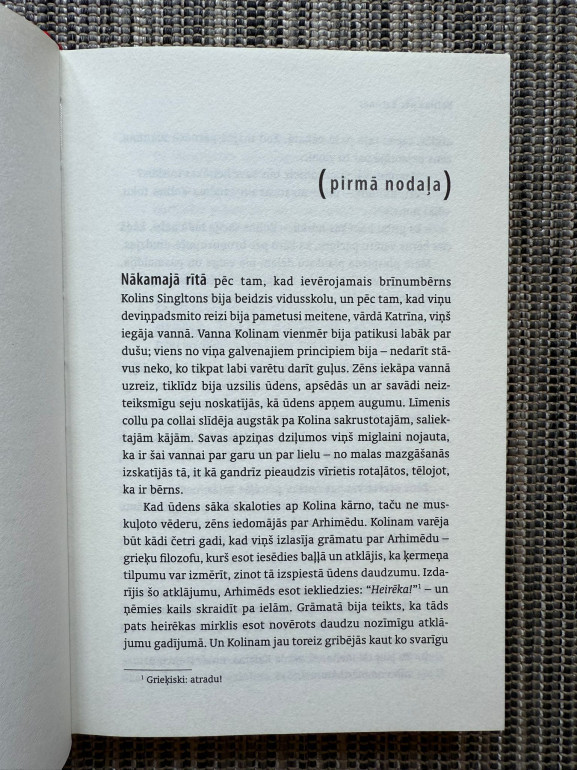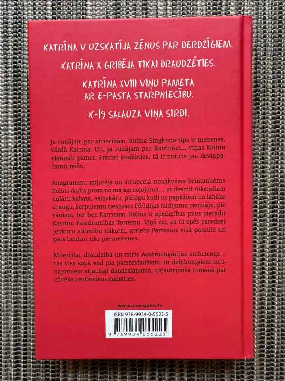 | Džona Grīna romāns "Katrīna pēc Katrīnas" ir asprātīgs un sirsnīgs stāsts par Kolina Singletona ceļojumu pēc tam, kad viņu pametušas 19 meitenes vārdā Katrīna. Apņēmības pilns izstrādāt teorēmu, kas paredz attiecību iznākumu, Kolins dodas piedzīvojumā kopā ar savu labāko draugu, meklējot mīlestību, jēgu un sevi. | |