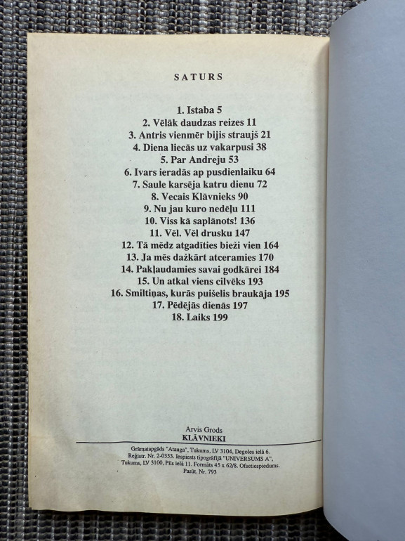| Grāmata “Klāvnieki” (Arvis Grods) ir emocionāls vēstījums par ģimenes attiecībām – par otro dēlu, viņa brāļiem un tēvu, kurš vecumdienās cenšas izprast ģimenē piedzīvoto. Darbs atklāj personisku un introspektīvu skatījumu uz ģimenes dinamiku. | |