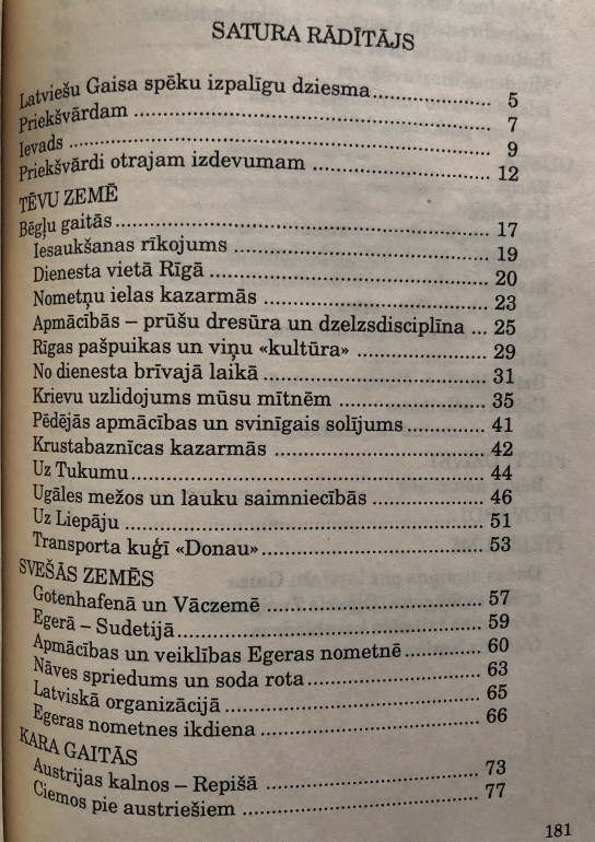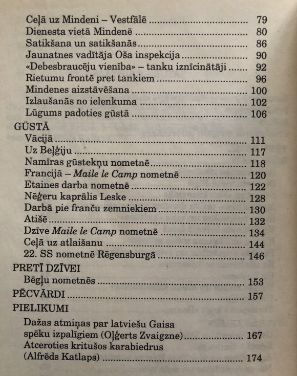| Par otrā pasaules kara ceļiem Latvijā un Vācijā. Grāmatas autors vēlreiz atmiņā izstaigā Gaisa spēku izpalīgos iesaukto latviešu skolnieku gaitas kara gados. Stāstījumu caurvij patriotisma un frontes romantikas motīvi. Autors pratis labi attēlot karavīru formas uzvilkušo zēnu raibos piedzīvojumus un vienlaikus izteikt sāpes par daudzajām kara dzirnakmeņos samaltajām jaunajām dzīvēm. | |