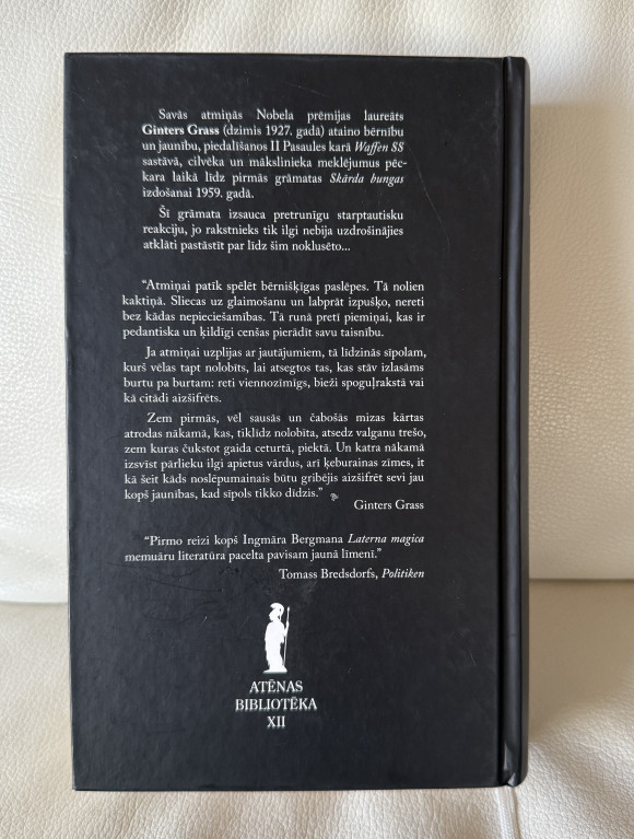 Nobela prēmijas laureāts. Šī grāmata izraisīja starptautisku reakciju, jo rakstnieks tik ilgi nebija uzdrošinājies atklāti pastāstīt par līdz šim noklusēto... «Pirmo reizi kopš Ingmāra Bergmana «Laterna magica» memuāru literatūra pacelta pavisam jaunā līmenī,» raksta «Politiken». "Ja atmiņai uzplijas ar jautājumiem, tā līdzinās sīpolam, kurš vēlas tapt nolobīts, lai atsegtos..." Ginters Grass