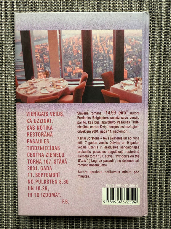 | Grāmata “Windows on the World” (Frédéric Beigbeder) ir emocionāli spēcīgs romāns, kas piedāvā autora iztēlotu versiju par to, kas notika Pasaules Tirdzniecības centra Ziemeļu torņa 107. stāvā 2001. gada 11. septembrī. Stāsts seko tēvam un viņa diviem dēliem, kuri ieradušies brokastīs, kad sākas terorakts. | |