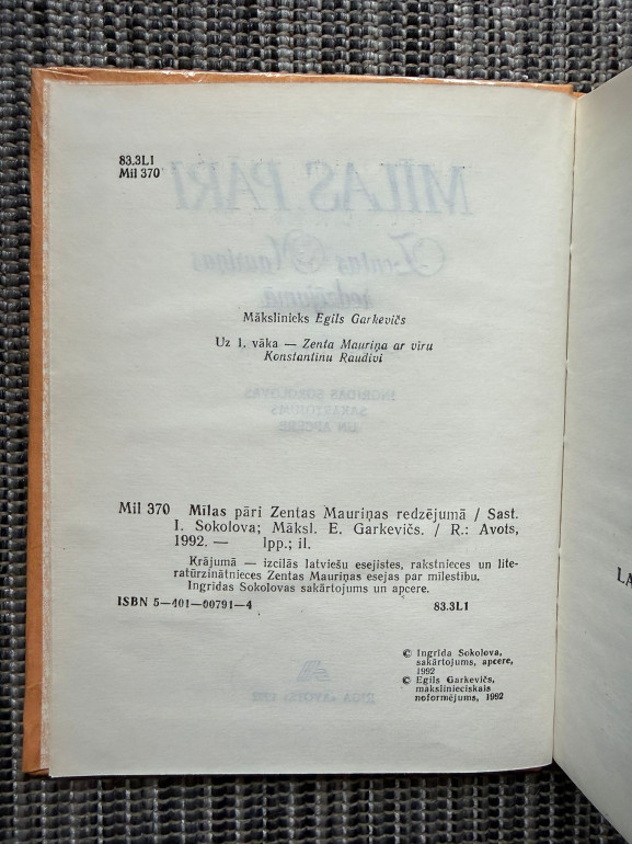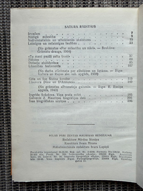 | Eseju izlase par vēsturiskiem un literāriem mīlas pāriem – Gēti un fon Šteina kundzi, Eleonoru Dūzi un D’Annuncio u.c. Mauriņa atklāj mīlestības garīgo dimensiju, apvienojot filozofiju ar personisku skatījumu. | |