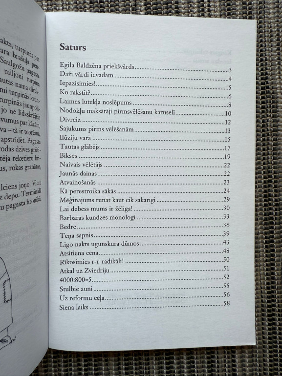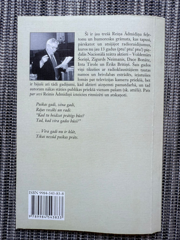 | Ar autora novēlējumu Trešais feļetonu un humoresku krājums, veidots no radioraidījumu materiāliem. Reinis Ādmīdiņš ar humoru un ironiju attēlo sabiedrības raksturus un ikdienas dzīves ainiņas. | |