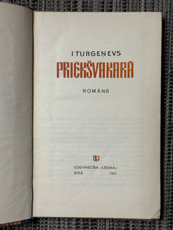 | Grāmata “Priekšvakarā” (Ivans Turgeņevs) ir romāns par jaunās krievu sievietes Jeļenas dzīves ceļa krustcelēm lielo pārmaiņu laikmeta priekšvakarā. Viņa ilgojas pēc patiesas mīlestības un augstākiem ideāliem, izvēloties starp trim viņu mīlošiem jaunekļiem – mākslinieku Šubinu, zinātnieku Berseņevu un bulgāru Insarovu, kas cīnās par dzimtenes brīvību. Darbs spilgti atklāj psiholoģiju un ideālu mekl | |