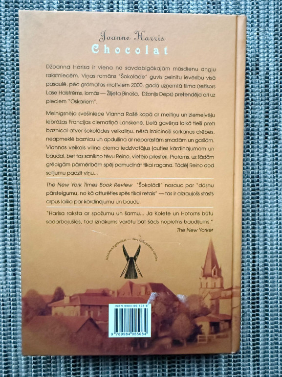 | Grāmata Šokolāde (Džoanna Harisa) ir juteklisks un noslēpumains stāsts par sievieti, kas atver šokolādes veikalu nelielā franču pilsētiņā, izaicinot vietējās tradīcijas un atklājot kaislību, brīvības un izvēles spēku. Romāns apbur ar garšu, emocijām un kultūras kontrastiem. | |