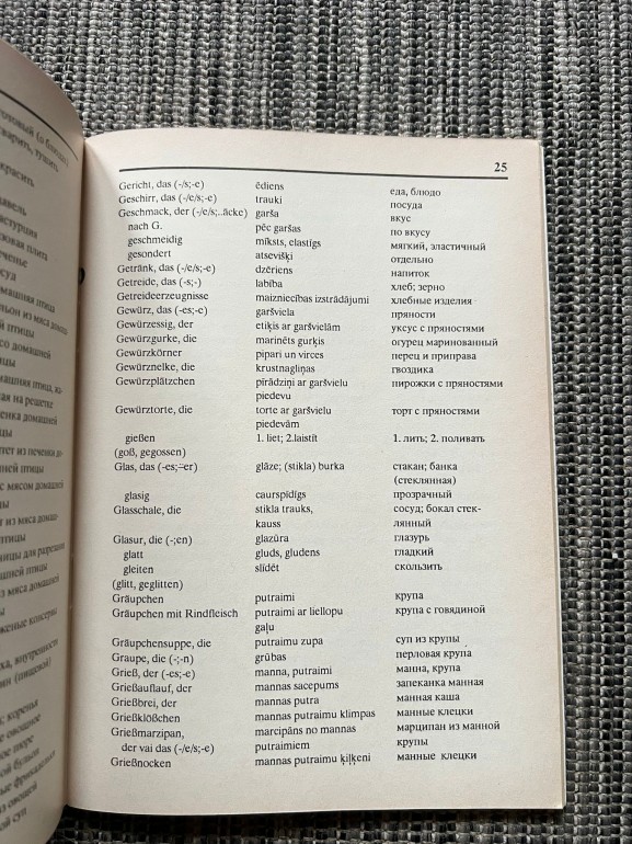 | Kā jauns, 1993 Baltika, 75 lpp, Vārdnīca domāta mājsaimniecēm un sievietēm, kuras pēc receptēm, piegrieznēm, aprakstiem un pamācībām , kas publicētas populārajos vācu sieviešu žurnālos "Burda", "Moden"', Verena", u.c. gatavo ēdienu, šuj tērpus un nodarbojas ar rokdarbiem.. | |
