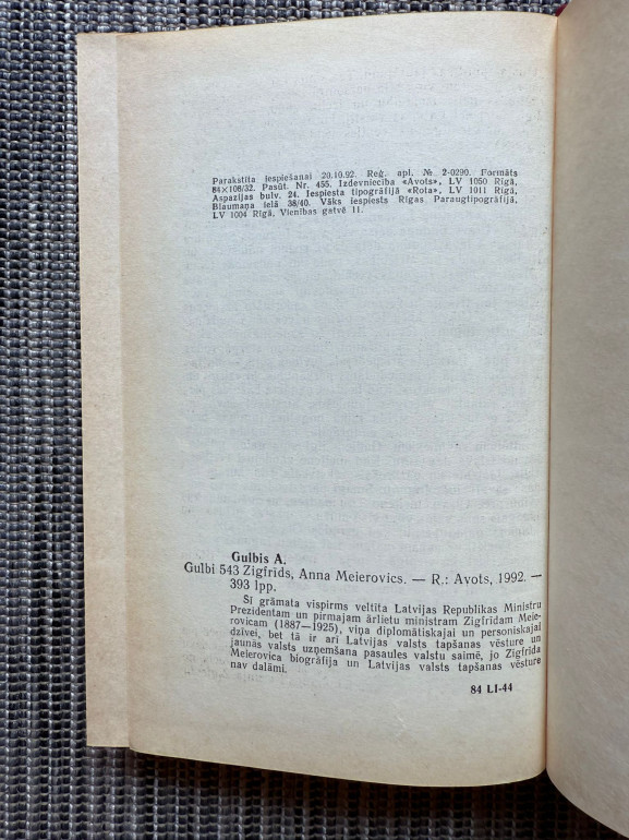 | Anša Gulbja biogrāfiskais romāns par Zigfrīdu Annu Meierovicu – pirmo Latvijas ārlietu ministru un vienu no valsts dibinātājiem. Grāmata atklāj viņa dzīves ceļu, politisko darbību un personību, kas ietekmēja Latvijas likteni 20. gadsimta sākumā. | |