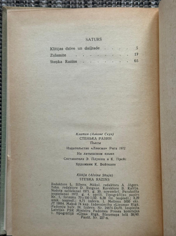 | Grāmatā apvienotas divas lugas: “Sulamite”, kas balstīta Bībeles motīvos un atklāj mīlestības un likteņa traģiku, un “Steņka Razins”, kurā romantisma garā attēlots leģendārais kazaku vadonis un viņa dumpīgā cīņa pret carisko varu. Īpašs darbs ar lirisku valodu un vēsturisku kolorītu. | |