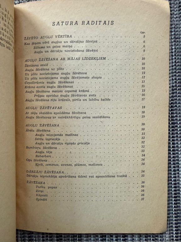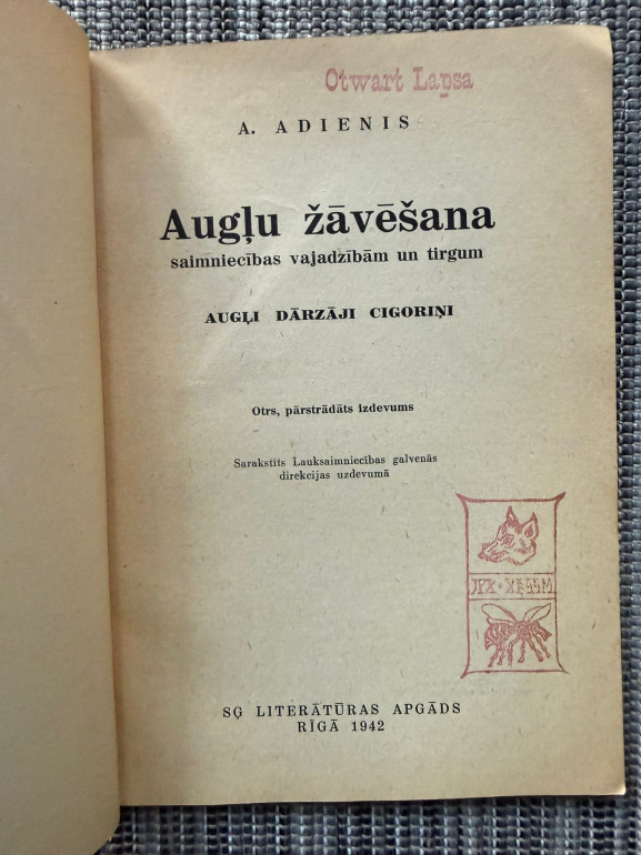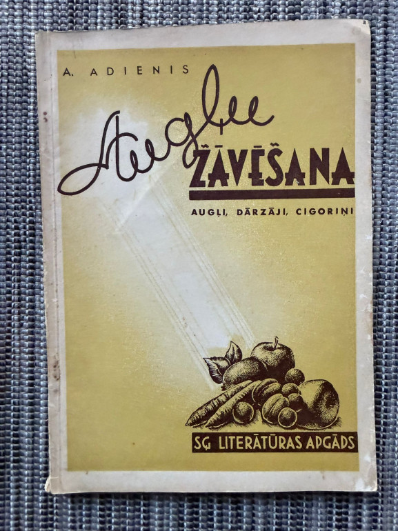 | Grāmata “Augļu žāvēšana” (Aleksandrs Adienis, 1942) ir praktisks ceļvedis augļu un dārzeņu žāvēšanai saimniecības vajadzībām un tirgum. Tajā skaidrota žāvēšanas nozīme, priekšrocības salīdzinājumā ar citiem konservēšanas veidiem, sniegti padomi par žāvētavu ierīkošanu, augļu sagatavošanu, uzglabāšanu un izmantošanu. Apjoms – ap 45–54 lpp., izdevējs SĢ Literatūras apgāds. | |