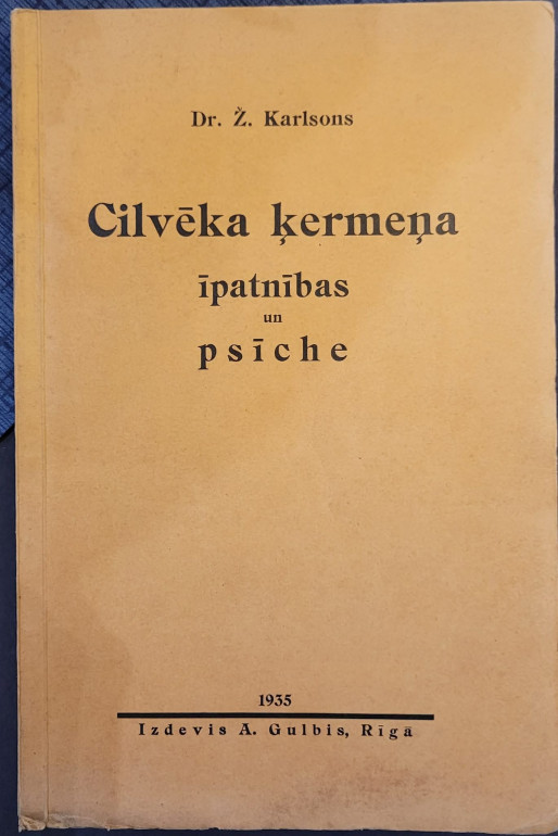 | Dr.Ž.Karlsons "Cilvēka ķermeņa īpatnības un psīche" 1935.gada A.Gulbja izdevums, cena 25,-€, stāvoklis labs, ātrākai saziņai WhatsApp tālr.29535459. | |