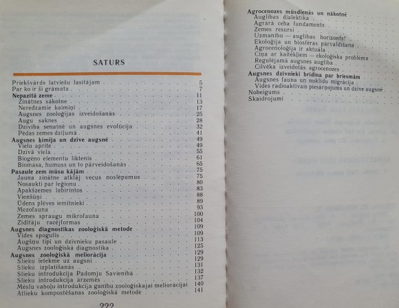 | Saistošs stāstījums ar interesantiem piemēriem par augsni - par mikroorganismiem un dzīvniekiem, kuri tajā mitinās. Grāmatas autori saistoši, ar interesantiem piemēriem stāsta par pasauli, kas atrodas mums zem kājām, - par augsni, mikroorganismiem un dzīvniekiem, kas tajā mitinās. 1989., 223 lpp. | |