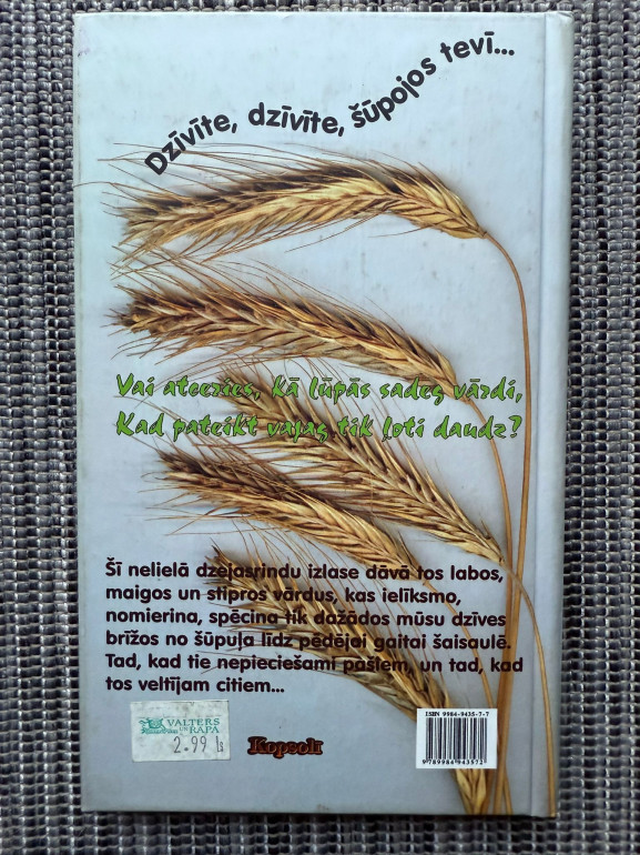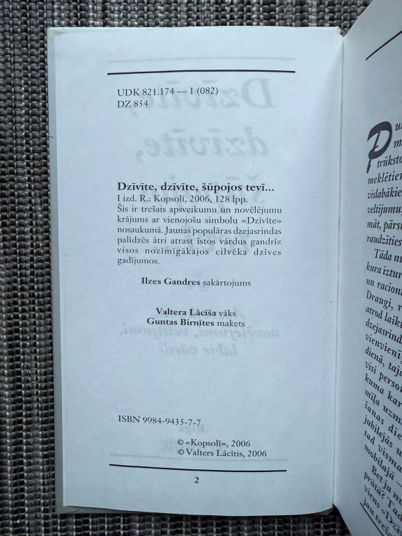 | "Dzīvīte, dzīvīte, šūpojos tevī..." ir Ilzes Gandres dzejoļu izlase ar maigiem un stipriem vārdiem, kas ielīksmo, nomierina un stiprina dažādos dzīves brīžos – no šūpuļa līdz pēdējai gaitai. Piemērota gan sev, gan kā sirsnīgs veltījums citiem. | |