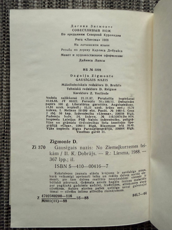 | Grāmata “Gausīgais nazis” (Dagnija Zigmonte, 1988) ir stāstu krājums, kurā literāri pārstāstītas un paplašinātas Ziemeļkurzemes teikas. Tajās sadzīves detaļas mijas ar mitoloģiskiem tēliem – zemnieki, mācītāji, velns, aprakti naudas podi. Autore izmanto apcerīgu, bagātīgu valodu, atklājot kristīgās darba ētikas motīvus un cilvēku alkas pēc vieglas naudas. | |