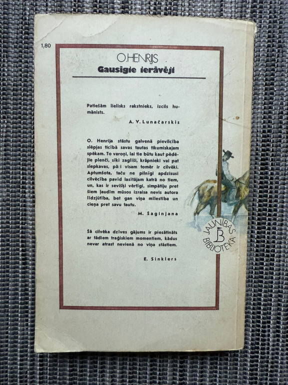 | "Gausīgie ierāvēji" ir O. Henrija stāstu krājums, tulkots no angļu valodas un sastādīts ar A. Dzenīša ievadvārdiem. Grāmatā apkopoti asprātīgi, ironiski un cilvēcīgi stāsti, kas raksturīgi Henrija stilam – ar negaidītiem sižeta pavērsieniem un sirsnīgu humoru. Izdota 1984. gadā, izdevniecībā "Liesma". | |
