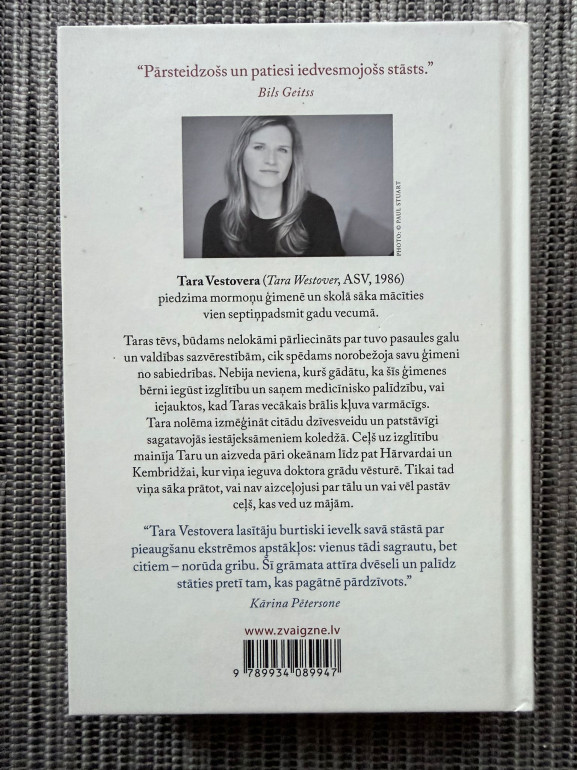 | Atklāta un iedvesmojoša autobiogrāfija par autores ceļu no izolētas bērnības mormoņu ģimenē līdz akadēmiskajai izcilībai. Grāmata pēta izglītības spēku, pašatklāsmi un attiecības ar ģimeni, uzsverot drosmi pārvērtēt savu pasauli un sevi pašu. | |