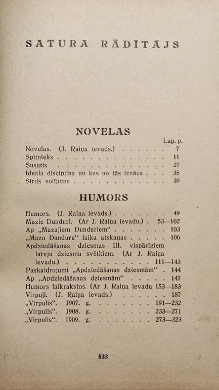 | Kopotie raksti, 1925.g izdevums A.Gulbja apgādā. Sarkanie vāki. Biografija un kopotie raksti ar paša autora ievadiem un komentāriem. 10. sējums - "Novelas", "Humors" un "Fragmenti" (no nepabeigtiem darbiem). | |