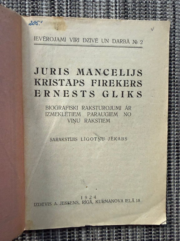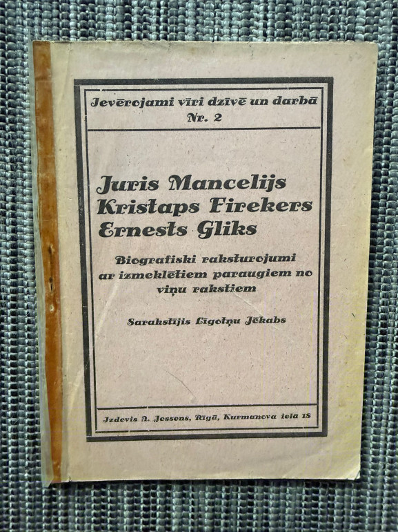 | Grāmata “Juris Mancelijs, Kristaps Fīrekers, Ernests Gliks” (Līgotņu Jēkabs, 1924) ir biogrāfiska proza, kas sniedz raksturojumus par trim ievērojamiem latviešu kultūras un garīgās dzīves darbiniekiem – Manceli, Fīrekeru un Gliku. Tajā iekļauti arī paraugi no viņu rakstiem, atklājot ieguldījumu latviešu valodas, literatūras un izglītības attīstībā | |