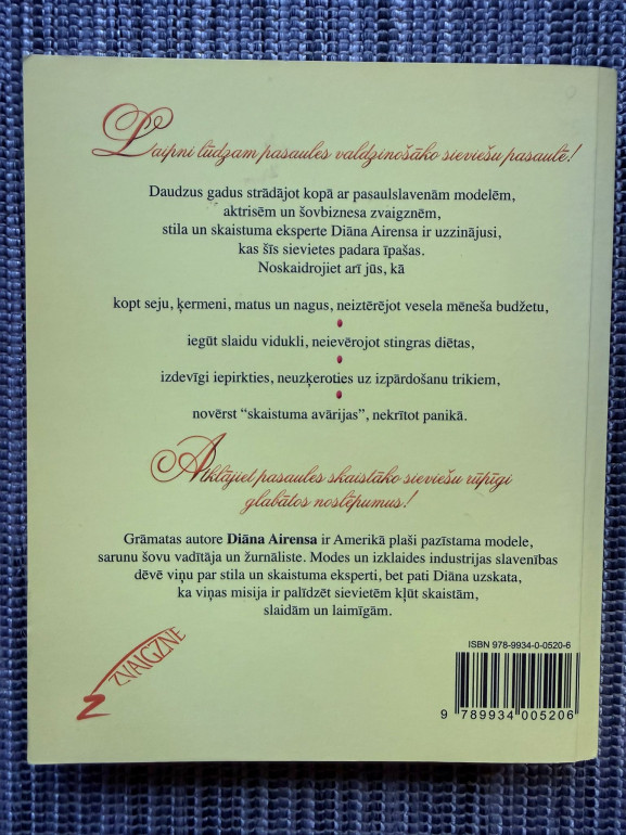 | Grāmata "Rūpīgi glabātie skaistuma noslēpumi" ir amerikāņu stila un skaistuma ekspertes Diānas Airensas praktisks ceļvedis, kurā apkopoti padomi sejas, ķermeņa, matu un nagu kopšanai, slaiduma iegūšanai bez diētām un skaistuma triku izmantošanai ikdienā. | |