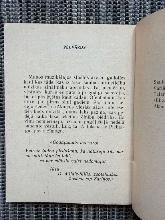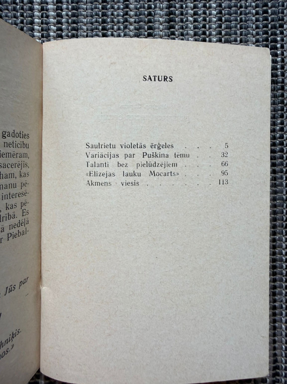 | Marģera Zariņa muzikālo stāstu krājums, kurā realitāte savijas ar fantāziju, ironiju un muzikāliem motīviem. Autors spēlējas ar mākslas un dzīves robežām, radot neparastus tēlus un situācijas, kas izaicina gan lasītāja iztēli, gan mūzikas zinātāju priekšstatus. | |
