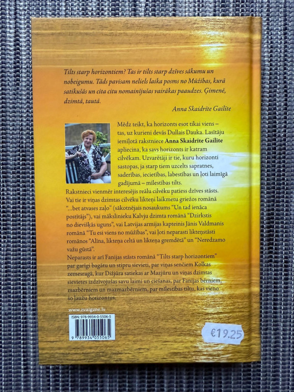 | Anna Skaidrīte Gailīte “Tilts starp horizontiem” – romāns par ģimenes saknēm, paaudžu pieredzi un atmiņām par Sibīrijas nometnēm. Stāsts par saprašanās un mīlestības tiltu starp cilvēkiem, kas dzīvo dažādos laikos, bet ir vienoti likteņa ceļā. | |