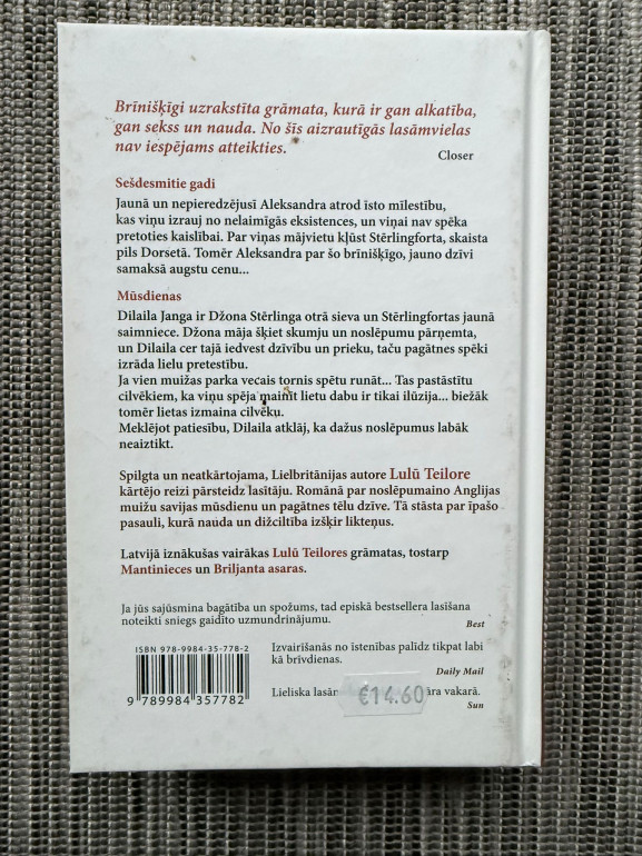 | rāmata “Torņa vilinājums” ir Lulū Teilores gotiskas noskaņas romantiska drāma ar divu laiku līniju: 1960. gados Aleksandra, aizbēgot no neveiksmīgas laulības, nonāk Stērlingfortas pilī Dorsetā, kur mīlestība un kaislība nāk kopā ar augstu cenu; mūsdienās Dilaila kā pils saimniece atduras pret senas dzimtas noslēpumiem, kurus it kā glabā parka vecais tornis. | |