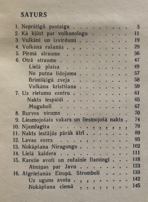 | Ievērojamais beļģu vulkanologs Taziefs šajā grāmatā stāsta par saviem neparastajiem ceļojumiem, kas saistīti ar vulkānu darbības pētīšanu. Taziefs apraksta pārsteidzošas ainas un parādības, kādas notikušas viņa novēroto vulkānu izvirdumu laikā. Grāmatā stāstīts par ziedošās Senpjēras pilsētas bojā eju, kā arī par citiem notikumiem, kas pamudinājuši cilvēci vērīgāk pētīt šo drausmīgo dabas parādību | |