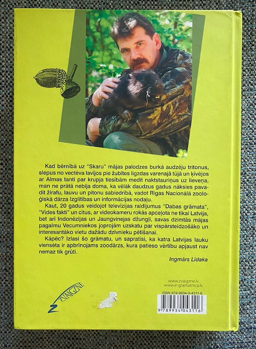 | Kad bērnībā uz “Skaru” mājas palodzes burkā audzēju tritonus, slepus no vectēva lavījos pie žubītes ligzdas varenajā tūjā un ķīvējos ar Almas tanti par krupja tiesībām medīt naktstauriņus uz lieveņa, man ne prātā nebija doma, ka vēlāk daudzus gadus nāksies pavadīt žirafu, lauvu un pitonu sabiedrībā, vadot Rīgas Nacionālā zooloģiskā dārza Izglītības un informācijas nodaļu. | |